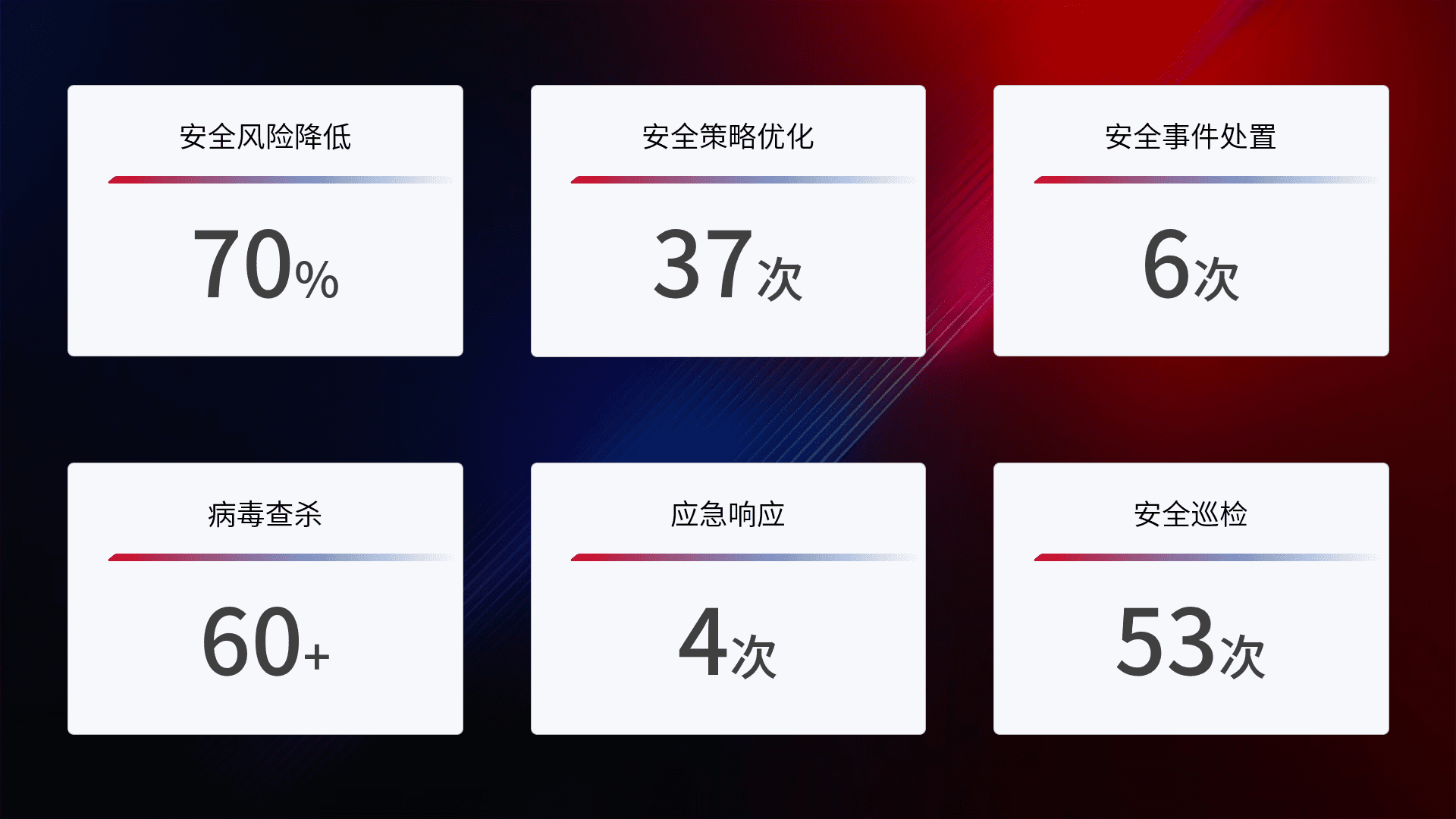 提供全面的安全事件报告体系,,,包括处置报告、、周报、、、季度和年度总结,,,结合持续监控,,,帮助客户深入了解网络安全状况。。